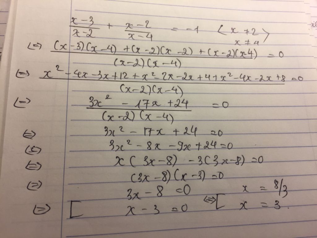 $\frac{x-3}{x-2}+\frac{x-2}{x-4}=-1⇔(x-3)(x-4)+(x-2)^2+(x-2)(x-4)=0⇔x^2-7x+12+x^2-4x+4+x^2-6x+8=3x^2-17x+24=0⇔\left[ \begin{array}{l}x=3\\x=\frac{8}{3}\end{array} \right.$ (thỏa mãn)