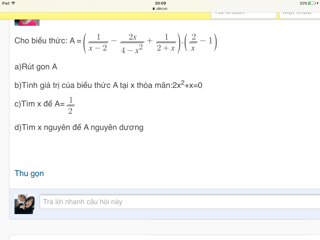 Vậy `x = 0` thì `A = -2` `,` `x = {-1}/2` thì `A = {-8}/3`