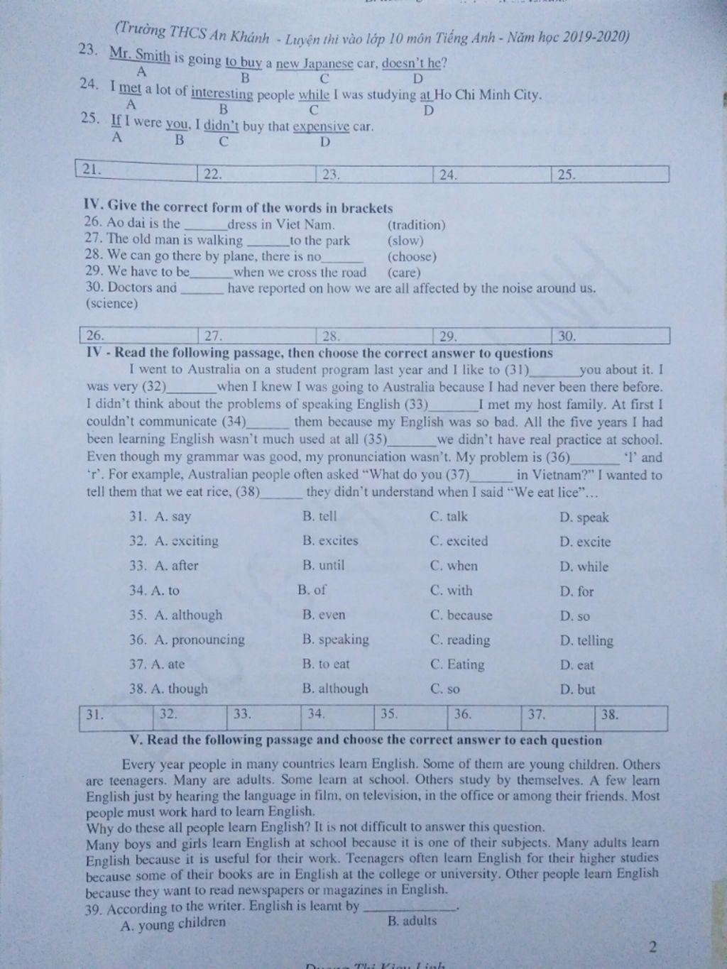 (Trương THCS An Khánh - Luyệên thi vào lớp 10 môn Tiếng Anh - Năm học 2019-2020) 25. Mr. Smith is going to buy a new Japanese car, doesn't he? 24. I met a