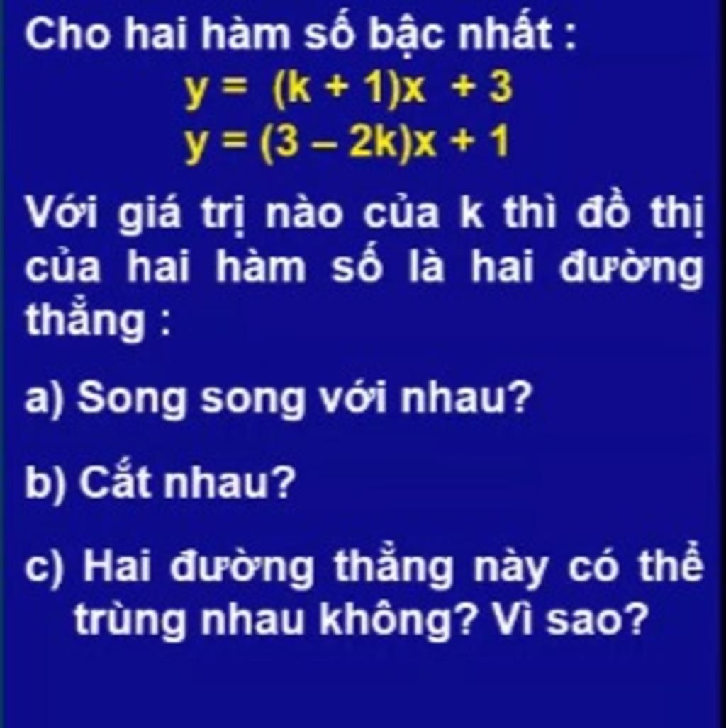 Cho hai hàm số bậc nhất : y = (k + 1)x +3 y = (3 – 2k)x + 1 Với giá trị nào của k thì đồ thị của hai hàm số là hai đường thẳng : a) Song song với nhau? b)