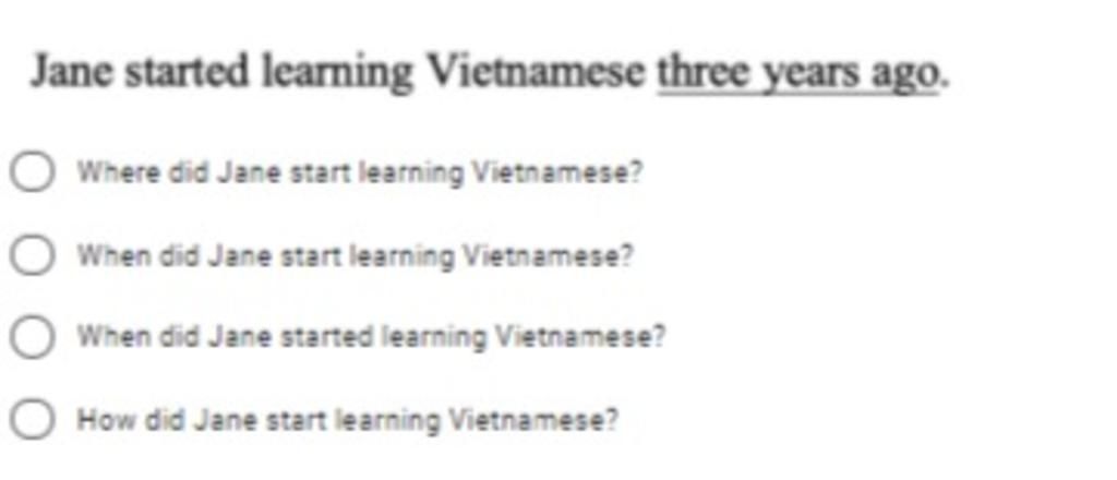 - Câu hỏi có gạch chân ở phần "three years ago (n): chỉ thời gian ba năm về trước" nên chọn "When".