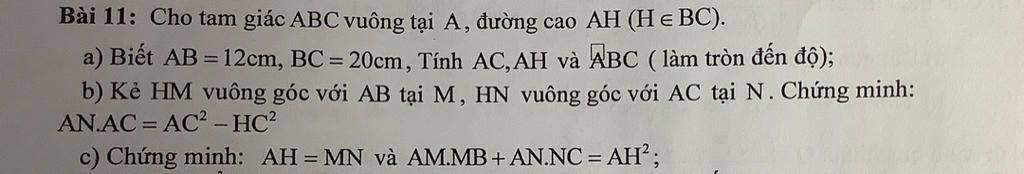 Bài 11: Cho tam giác ABC vuông tại A, đường cao AH (He BC). a) Biết AB = 12cm, BC = 20cm, Tính AC, AH và ABC ( làm tròn đến độ); b) Kẻ HM vuông góc với AB
