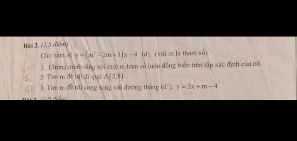 Bài 2. (2,5 điểm) Cho hàm só y =(m² - 2m + 3)x – 4 (d), (với m là tham số) C 1. Chứng minh rằng với mọi m hàm số luôn đồng biến trên tập xác định của nó. 2