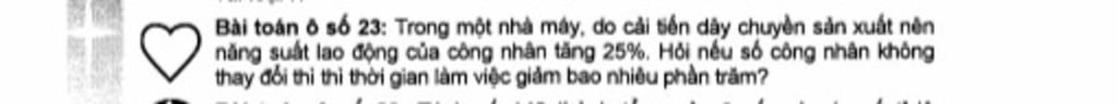 Bài toán ô số 23: Trong một nhà máy, do cai tien day chuyên sản xuất nên năng suất lao động của công nhân tăng 25%, Hoi néu số công nhân không thay đổi thi
