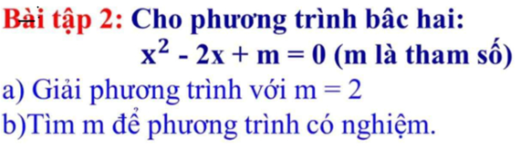 b) phương trình có nghiệm khi Δ >= 0 hay 4-4m >=0