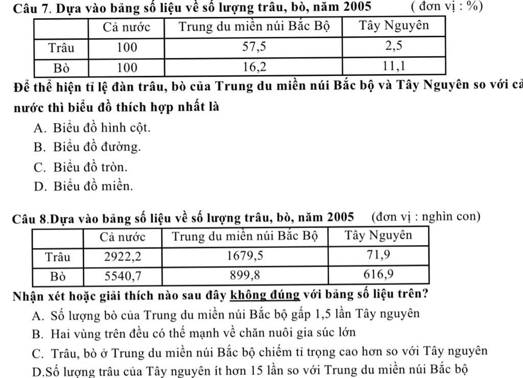 ( đơn vị : %) Câu 7. Dựa vào bảng số liệu về số lượng trâu, bò, năm 2005 Trung du miền núi Bắc Bộ Cả nước Tây Nguyên Trâu 100 57,5 2,5 Bò 100 16,2 11,1 Để