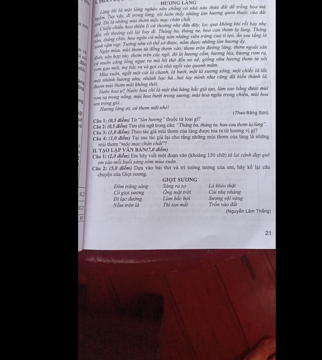 I. PHẢN ĐỌC - HIỂU (3,0 điểm): Đọc ngữ liệu sau và trả lời câu hỏi: Em nghe thầy đọc bao ngày Tiếng thơ đỏ nắng xanh cây quê nhà gn Mái chèo nghe vọng sông