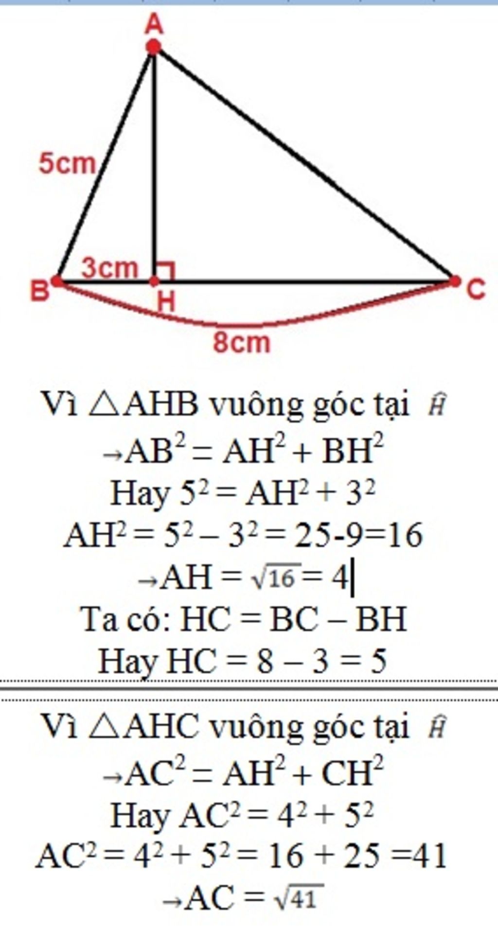 Câu 1. Cho ABC , kẻ AH VUÔNG GÓC BC. Biết AB = 5cm ; BH = 3cm ; BC = 8cm . Tính độ dài các cạnh AH, HC, AC? câu hỏi 515767 - hoctapsgk.com