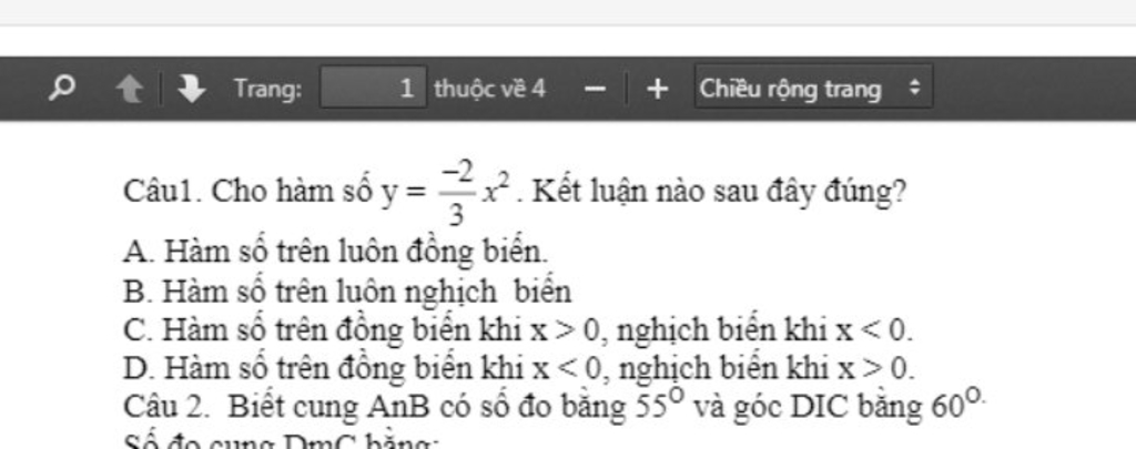 Trang: 1 thuộc về 4 Chiều rộng trang : 2. Kết luận nào sau đây đúng? 3 Câul. Cho hàm số y = A. Hàm số trên luôn đồng biến. B. Hàm số trên luôn nghịch biến