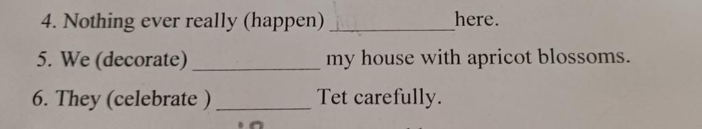 4. Nothing ever really (happen) here. 5. We (decorate) my house with apricot blossoms. 6. They (celebrate ) Tet carefully.