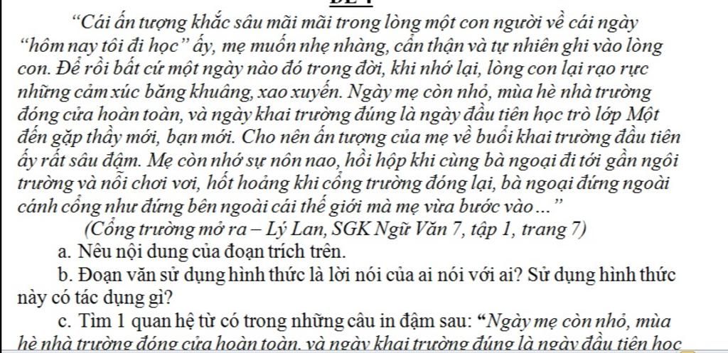 a, Nội dung của đoạn trích: sự hồi tưởng của người mẹ về ngày khai trường của mình.