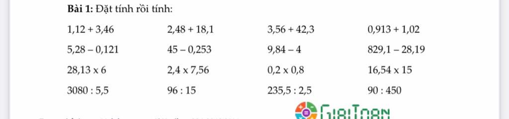 Bài 1: Đặt tính rồi tính: 1,12 + 3,46 2,48 + 18,1 3,56 + 42,3 0,913 + 1,02 5,28 - 0,121 45 - 0,253 9,84 - 4 829,1 – 28,19 28,13 x 6 2,4 x 7,56 0,2 x 0,8 16